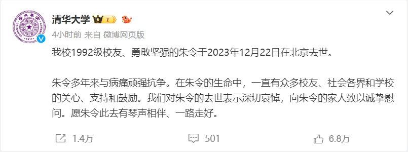 清華大學12月23日發布消息稱,該校1992級校友朱令于2023年12月22日在北京去世。