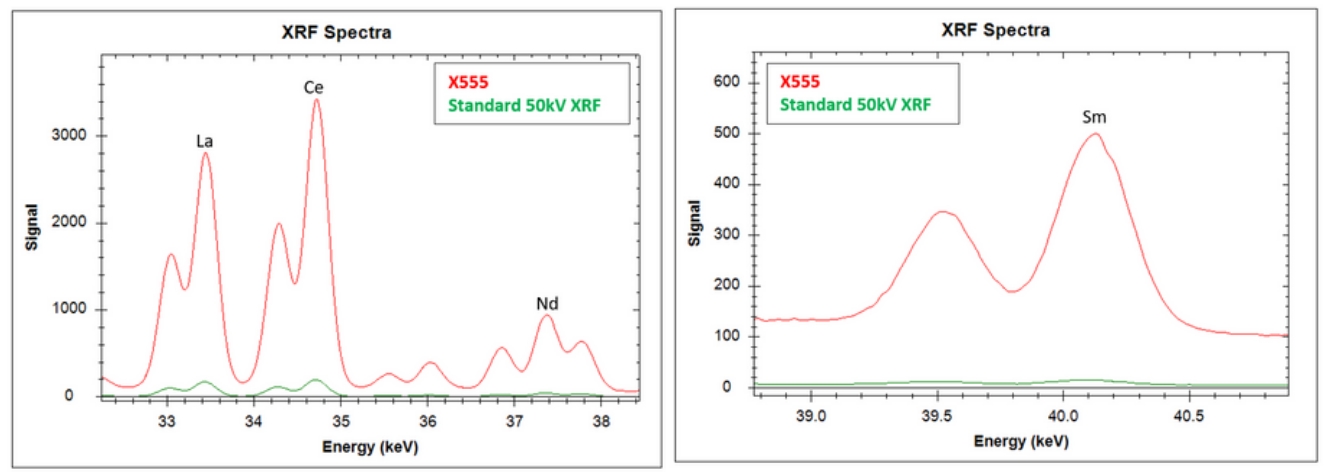 X-555利用55kV X射線管能更好地激發(fā)稀土元素能量。超大的70mm2 SDD硅源移探測器,更有效地檢測到更高的能量釋放,這實(shí)現(xiàn)了10倍更高的計數(shù)率(如:鑭)和30倍更高的計數(shù)率(如:釤Sm)。