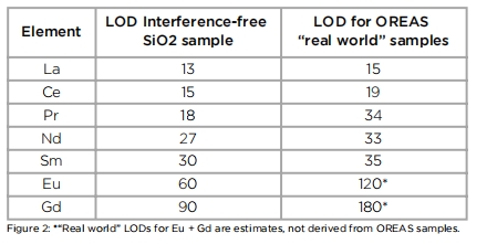 手持設(shè)備中的典型的X射線管只能工作到50 kV,稀土元素的有效激發(fā)能量差。而SciAps X-555采用55 kV的X射線管,大約能產(chǎn)生10倍以上的X射線有效激發(fā)能量。無干擾(二氧化硅)和高度具有挑戰(zhàn)性的OREAS REE礦石的值(這可以在圖2中找到)。LOD用于背景以上的3西格瑪檢測,120秒的測試時間。Sciaps光譜儀可作為化探手段。有規(guī)劃的進(jìn)行土壤、巖石露頭測試,剖面測試,光譜數(shù)據(jù)可作為地質(zhì)資料。常用礦石模式和土壤模式。無需進(jìn)行樣品制備或簡單樣品制備。
