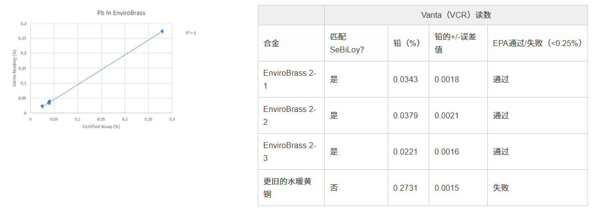 我們可以使用Vanta VCR型號(hào)分析儀,分析多種黃銅和銅合金認(rèn)證參考材料(CRM),以辨別出不同的重金屬和受到監(jiān)管的元素。Vanta XRF分析儀具有探測(cè)各種不同環(huán)境黃銅中低水平鉛元素的優(yōu)質(zhì)性能,可以確保所用水暖材料符合0.25%鉛含量的要求,如下圖所示。在所完成的鉛元素定量分析的過(guò)程中,10多次檢測(cè)的結(jié)果表明:鉛的含量都低于監(jiān)管的操作水平。此外,我們還分析了一個(gè)更舊的不符合規(guī)范的黃銅樣件,以進(jìn)行對(duì)比分析。