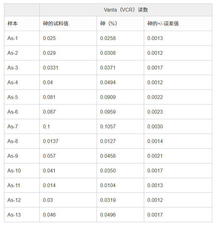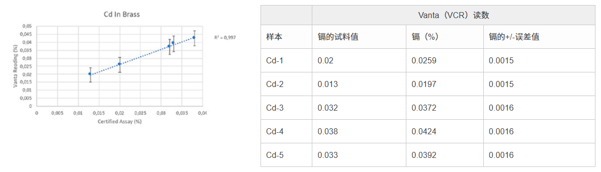 此外,Vanta分析儀還可以有效地測(cè)量會(huì)影響飲用水安全的多種其它元素,如:砷(As)和鎘(Cd)。下面顯示的是分析儀檢測(cè)多種黃銅認(rèn)證參考材料時(shí)獲得的有關(guān)其它有毒元素的檢測(cè)結(jié)果。