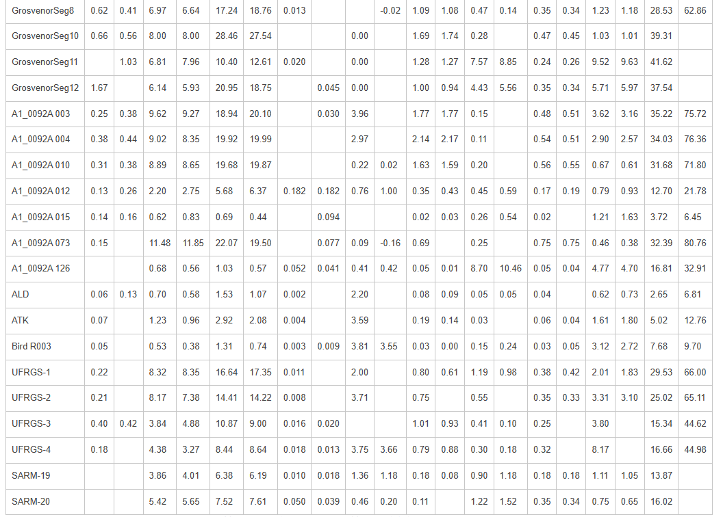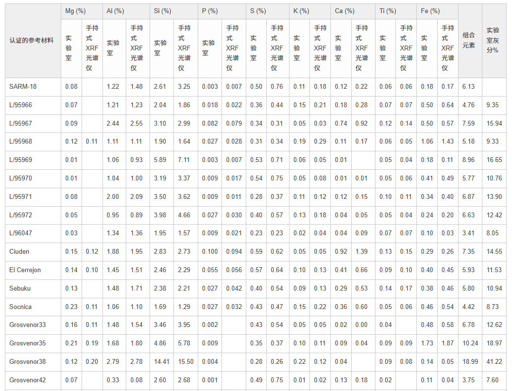圖2. 奧林巴斯手持式XRF光譜儀檢測(cè)大量煤認(rèn)證參考材料(CRM)獲得的結(jié)果與這些材料的標(biāo)稱(chēng)值高度吻合。上面的圖表表明對(duì)于重要元素:Mg、Al、Si、P、S、K、Ca、Ti和Fe,實(shí)驗(yàn)室認(rèn)證值和XRF分析儀獲得的數(shù)據(jù)值在準(zhǔn)確性和精確性方面都表現(xiàn)出高度的一致性。 數(shù)據(jù)表包含了繪制這些圖表所依據(jù)的實(shí)驗(yàn)室數(shù)據(jù)和XRF數(shù)據(jù)。數(shù)據(jù)承蒙新南威爾士大學(xué)生物和地球科學(xué)學(xué)院提供 - ACARP項(xiàng)目。