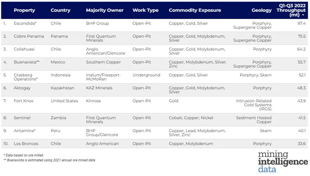 11月25日,礦業情報 (Mining Intelligence) 根據2022年1-3季度的礦石開采量(百萬噸)數據,發布了最新世界十大礦山排名。值得注意的是,除了印度尼西亞的格拉斯伯格礦山 (Grasberg),也是世界第二大銅礦,在2020年由地表轉入地下開采外 其它排名前十的礦山均為露天開采。