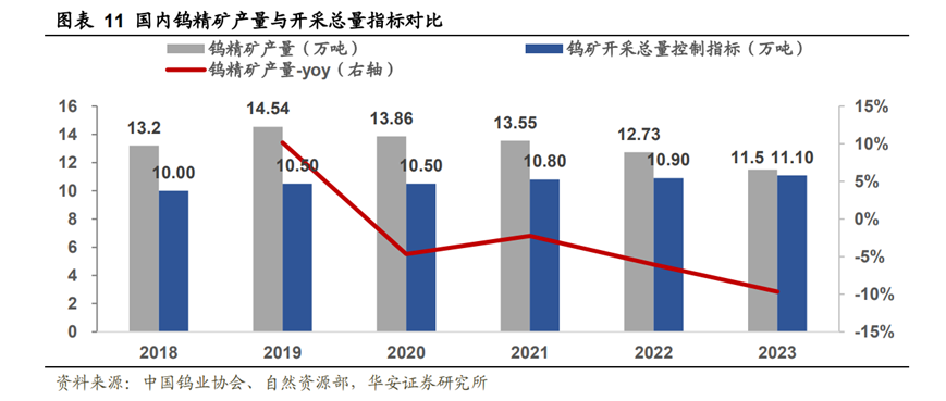 今年3月,自然資源部下達了2024年度首批僅為6.2萬噸的鎢礦開采總量控制指標,規(guī)模的收縮意味著國內(nèi)鎢精礦產(chǎn)量將延續(xù)下滑趨勢。隨著中國對鎢資源采取總量控制、出口配額管理、國家收儲等逐步收緊行業(yè)政策的實施,預計未來全球鎢礦供應將逐步趨緊,鎢的產(chǎn)量增速將逐步放緩。