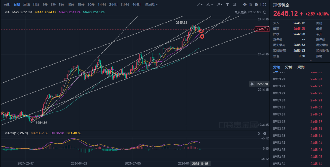 行情回顧:近期就業(yè)數(shù)據(jù)靚麗,投資者降低了對(duì)美聯(lián)儲(chǔ)11月大幅降息的預(yù)期,美元保持強(qiáng)勢(shì),美債收益率時(shí)隔兩個(gè)月首次升破4%,令金價(jià)承壓。現(xiàn)貨黃金延續(xù)回調(diào),錄得日線四連陰,盤中最低觸及2637.71美元/盎司,最終收跌0.40%,報(bào)2642.63美元/盎司,市場(chǎng)對(duì)美聯(lián)儲(chǔ)降息幅度的預(yù)期減少。
