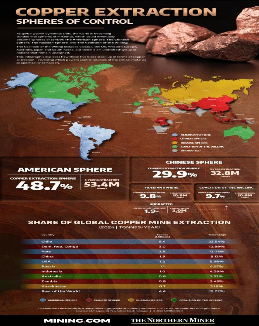 從世界維度來看,美國作為頭號資本強國,通過跨國礦業(yè)巨頭控制著全球眾多優(yōu)質(zhì)銅礦資源。美國本土占主導(dǎo)的是斑巖型銅礦,依賴大規(guī)模露天開采和先進選礦技術(shù),環(huán)保成本較高,銅礦平均品位較低(0.4%-0.6%),低于智利(0.7%-1%),開采成本較高(全球前10大低成本銅礦中無美國項目)。出于資本逐利的本性,跨國礦業(yè)巨頭優(yōu)先“掐尖”占有和開發(fā)全球成本最低的優(yōu)質(zhì)銅礦,這也是美國國內(nèi)銅礦開發(fā)滯后的一個重要原因。近期MINING網(wǎng)站和北方礦業(yè)從地緣政治的角度繪制了銅資源控制全球地圖,根據(jù)地理、社會、文化和經(jīng)濟聯(lián)系以及在更加兩極分化的世界中可能出現(xiàn)的結(jié)盟,將世界的銅資源分成五個“控制范圍”:美國、中國、俄羅斯、自愿聯(lián)盟和未開發(fā)。過去五年,美國以48.7%的全球銅產(chǎn)量領(lǐng)先,中國以29.9%緊隨其后,俄羅斯和自愿聯(lián)盟各占不到10%,還有1.9%未被開發(fā)。通過此圖可以看出,美國資本所控制的跨國礦業(yè)集團還是優(yōu)先開發(fā)全球具有成本競爭力的銅礦項目。