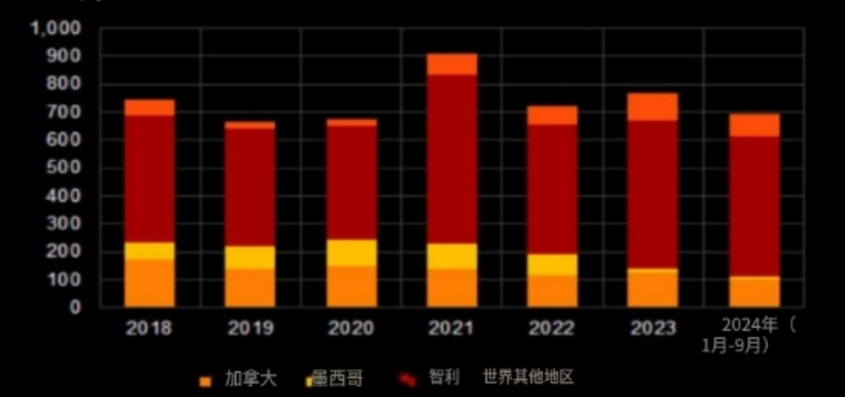 根據(jù)2025年USGS發(fā)布數(shù)據(jù),2024年美國共有25個銅礦山,其中17個占總產(chǎn)量99%以上。由于礦石品位降低,銅礦產(chǎn)量比2023年下降3%,國內(nèi)開采銅產(chǎn)量為110萬噸,位列全球第五。精煉銅產(chǎn)量為89萬噸,比2023年略有增長,位居全球第六。精煉銅進口81萬噸,主要來自智利65%、加拿大17%、墨西哥9%、秘魯6%、其他國家3%。回收銅約占美國銅供應(yīng)的35%,美國是世界上最大的廢銅出口國,每年出口近百萬噸,大部分被運到中國進行加工。通過以上數(shù)據(jù)可以看出,一方面是美國國內(nèi)銅礦資源開發(fā)緩慢,另一方面是國內(nèi)冶煉加工能力短板凸顯。