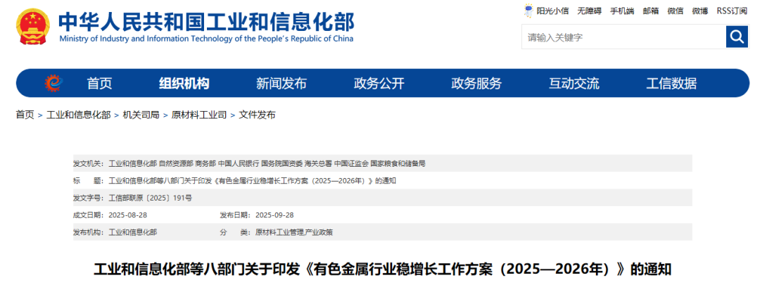 近日,工業(yè)和信息化部、自然資源部、商務(wù)部等八部門聯(lián)合印發(fā)《有色金屬行業(yè)穩(wěn)增長工作方案(2025-2026年)》(以下簡稱《工作方案》)。